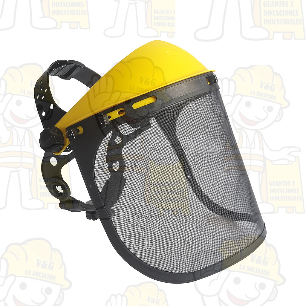 Protector facial con visor en malla, ideal para trabajos de guadañado y corte de césped. Incluye capucha plástica resistente, cabezal ajustable, lo que brinda protección contra residuos proyectados sin limitar la visibilidad ni generar empañamiento.