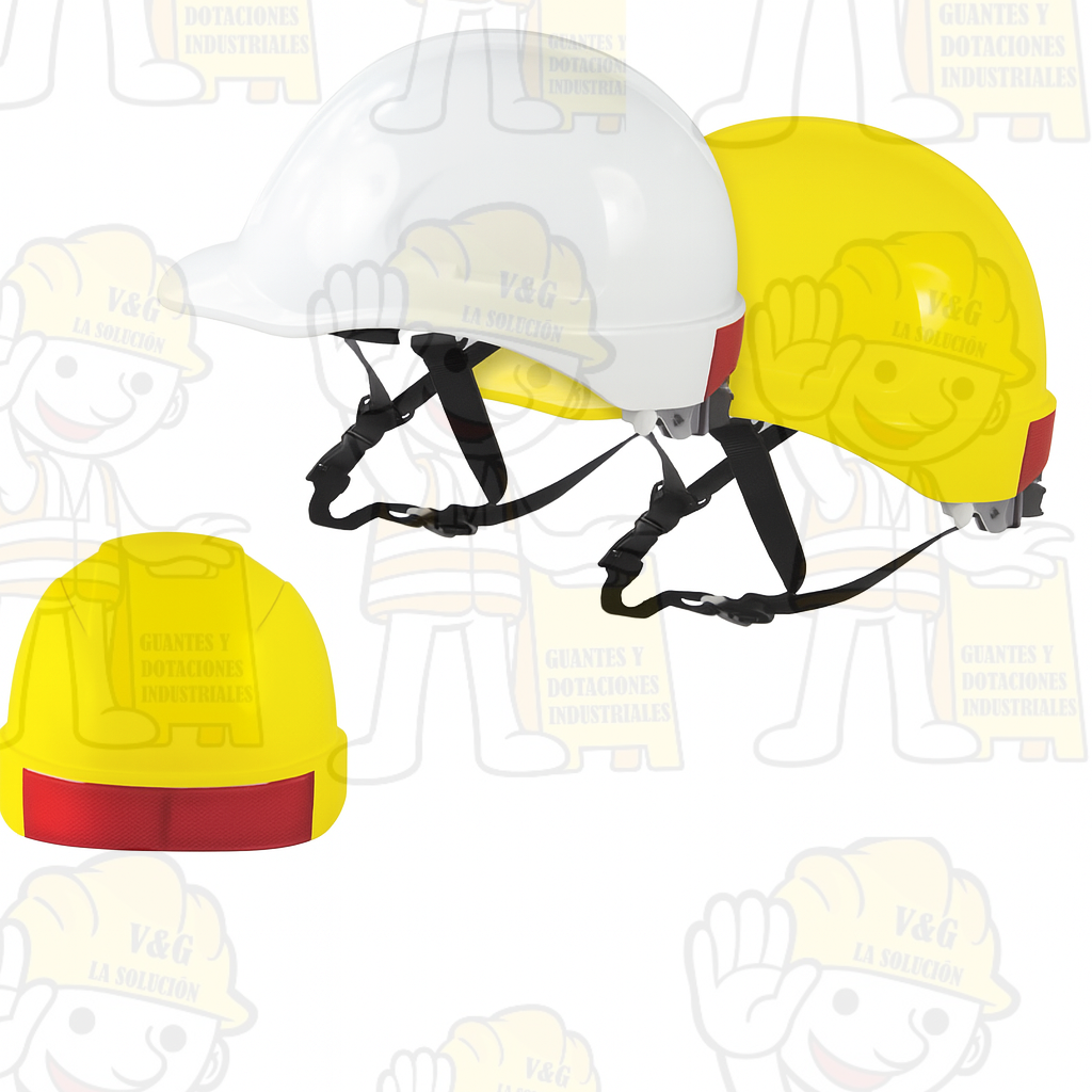 Casco certificado clase E, diseñado para ofrecer protección contra impactos laterales y verticales. Cuenta con icopor interno para mayor absorción de impactos y cinta reflectiva trasera para alta visibilidad; ideal para trabajos en alturas, eléctricos e industriales.