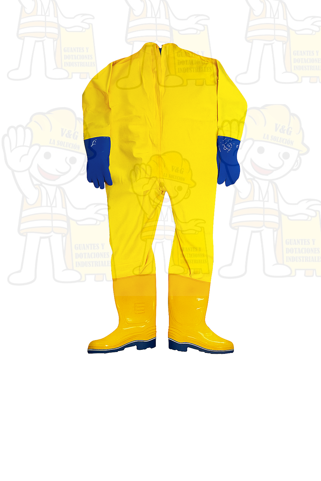 Conjunto impermeable en una sola pieza, fabricado en PVC resistente. Incluye guantes y botas adheridas, ideal para labores de alto riesgo en ambientes húmedos, químicos o contaminantes. Brinda máxima protección corporal.