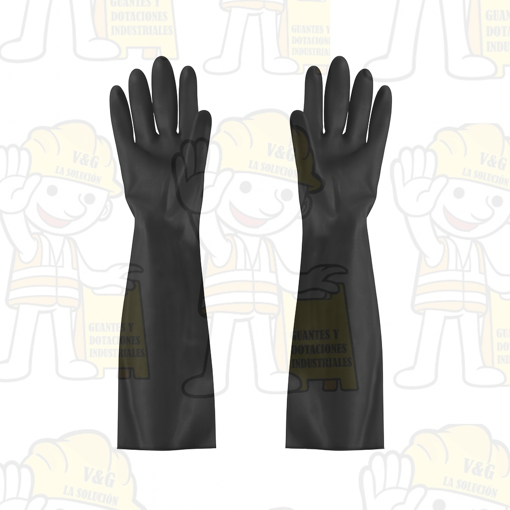 Guante largo de caucho negro, ideal para trabajos con exposición a líquidos, químicos o ambientes húmedos. Su diseño extendido brinda mayor protección en brazos, asegurando seguridad y comodidad en tareas exigentes.