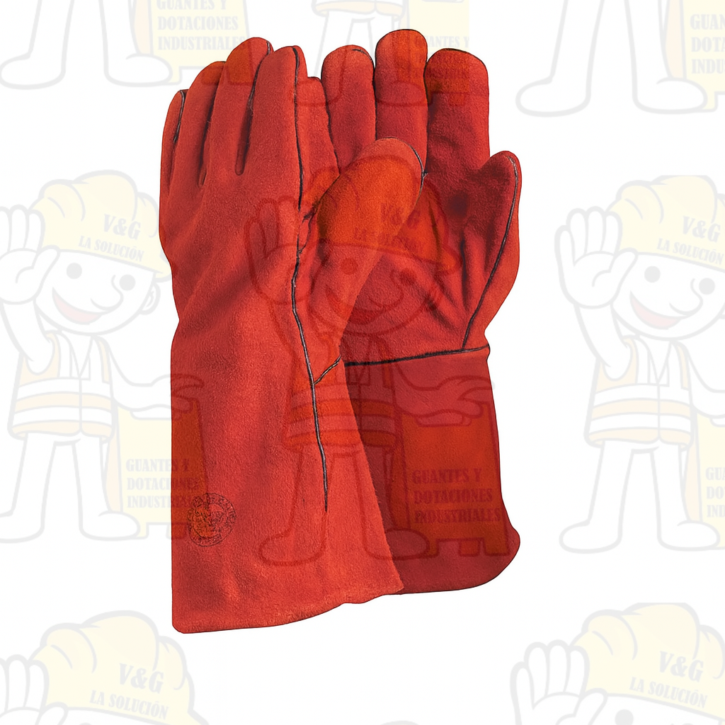 Guante tipo soldador en carnaza roja, resistente al calor y con costuras reforzadas. Proporciona protección confiable en trabajos de soldadura y altas temperaturas.