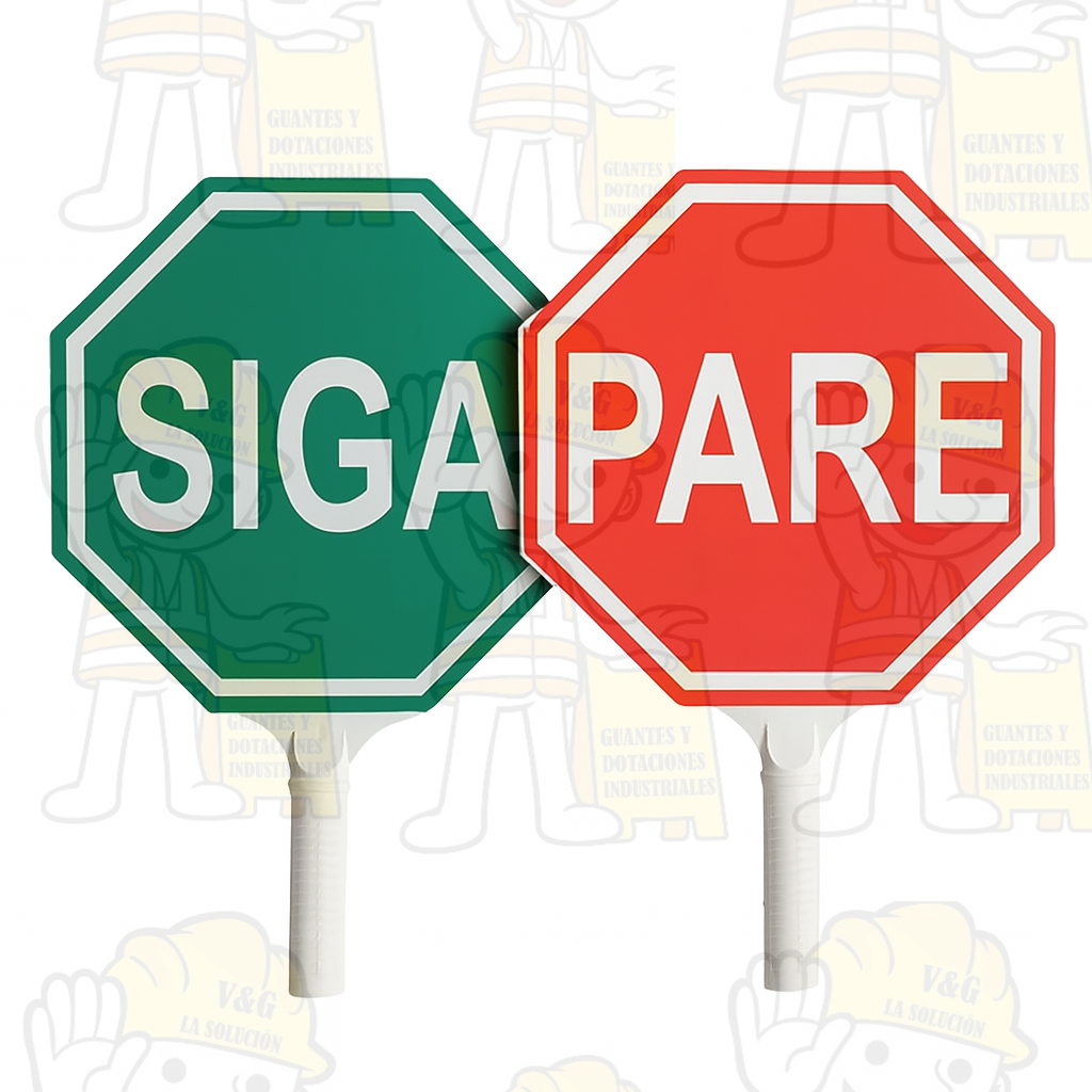Herramienta de señalización vial manual con diseño octagonal en doble cara: ‘PARE’ (rojo) y ‘SIGA’ (verde). Ideal para controlar el tránsito en zonas de obra, mantenimiento vial o eventos. Fabricada en material liviano y resistente, con mango ergonómico para fácil manipulación.