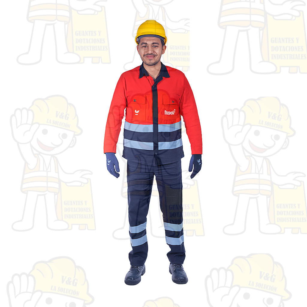 Uniforme bicolor con cintas reflectivas, ideal para labores de alta visibilidad. Incluye chaqueta y pantalón independientes.